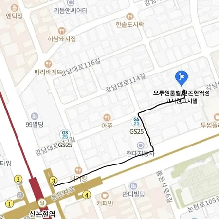 A legközelebbi repülőtér a Kimpho nemzetkozi repuloter, amely 30 km-re található az O2 Oneroomtel Shinonhyun Branch épületétől. A Yukdeok Restaurant és Hooters Gangnam fogások széles választékát kínálják 150 méterre a szállástól.